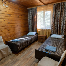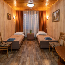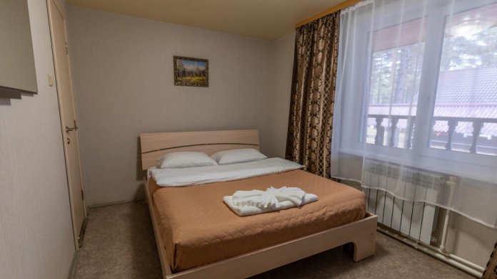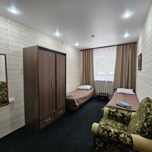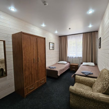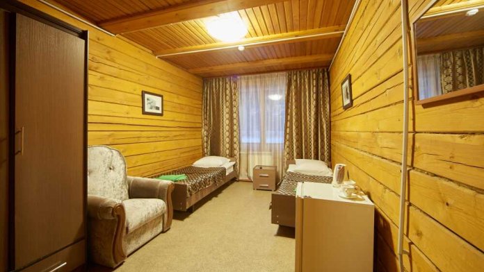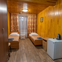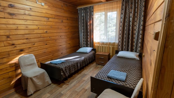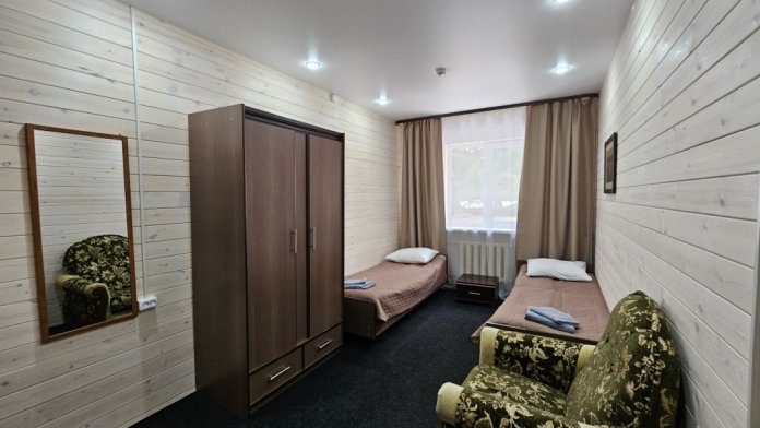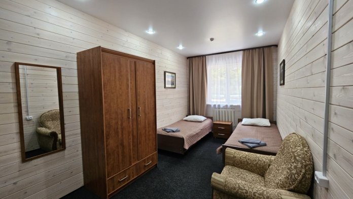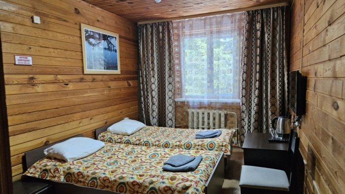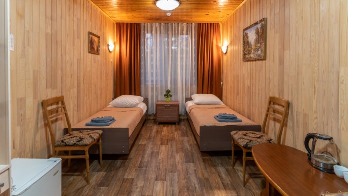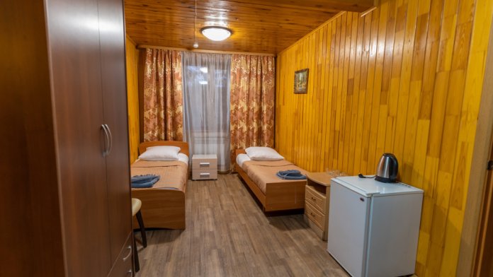 В каждом номере две односпальные кровати, прикроватные тумбочки, шкаф для одежды, телевизор, чайник, чайные пары.