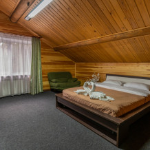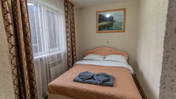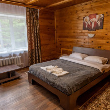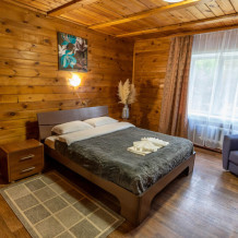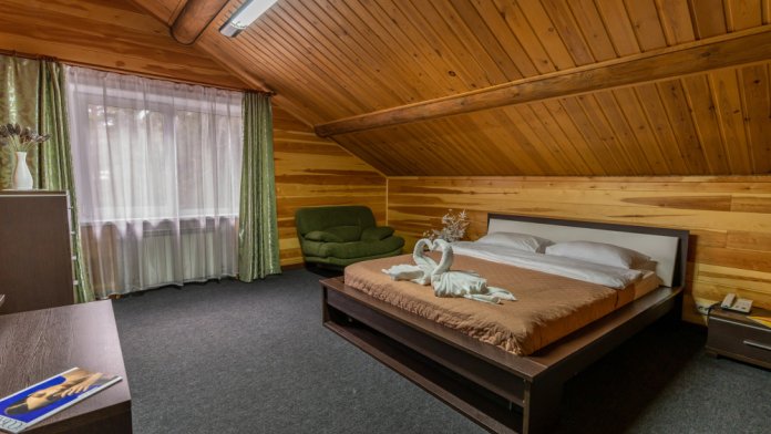 В номере: уютная гостиная с мягким диваном и обеденным столом, телевизором, чайником, чайными парами. В спальне одна двуспальная кровать. В ванной комнате: душевая кабина, санузел, раковина; набор полотенец, косметические принадлежности по запросу.