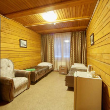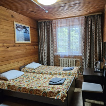 В каждой половине три двухместных номера с большими семейными кроватями. Одна из комнат проходная; две ванные комнаты: душевая кабина, санузел, раковина.