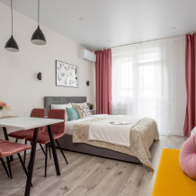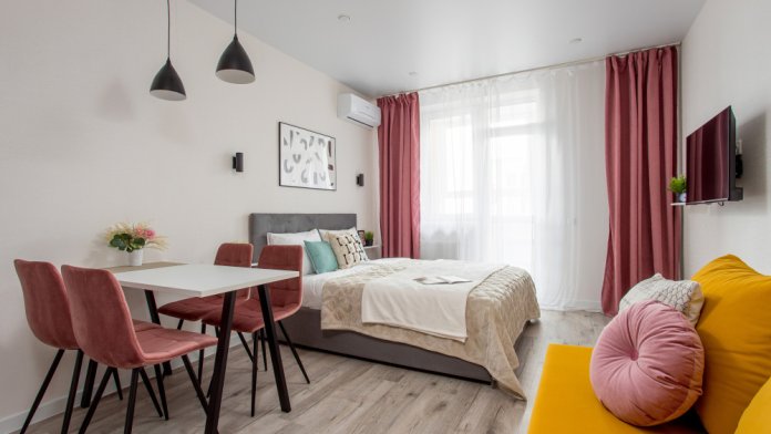 Студия «Нежность». В студии качественное гостиничное постельное белье из страйп-сатина, двуспальная кровать и двуспальный раскладной диван. Бесплатный Вай-Фай. Предоставляются полотенца и посуда, фен, утюг, гладильная доска, стиральная машина. В ванной комнате и на лоджии теплые полы.