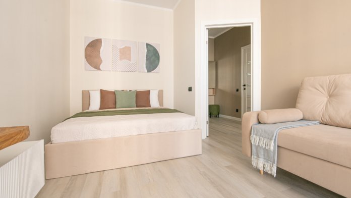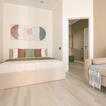 - Удобную двуспальную кровать с ортопедическим матрасом и раскладной диван для двух дополнительных мест.