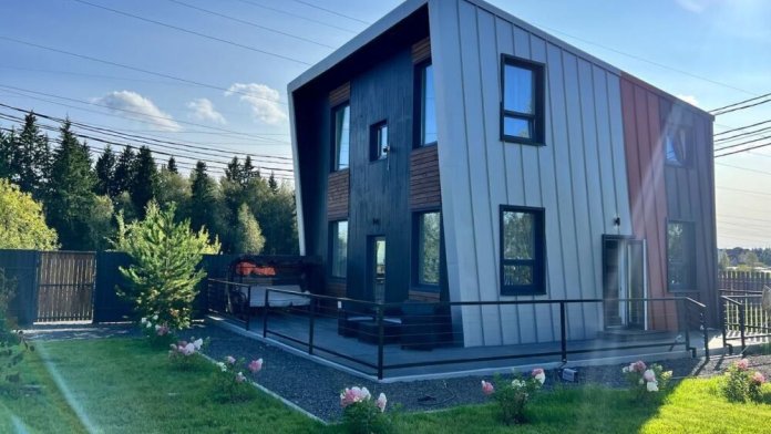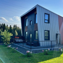 - 1 этаж: кухня-гостиная с обеденным столом и диваном, санузел, ванная, открытая веранда с мебелью и качелями.