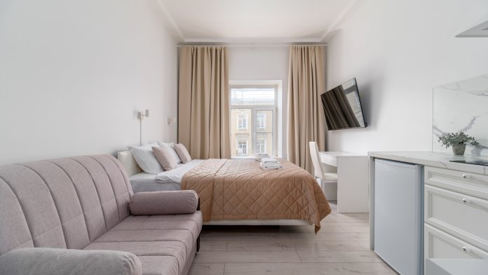 В студии свой санузел и оборудованная кухня. Бесплатный wi-fi.