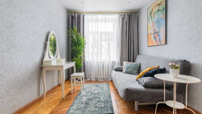 Просторная двухкомнатная квартира с оборудованной кухней и всем необходимым для проживания в историческом центре Санкт-Петербурга.