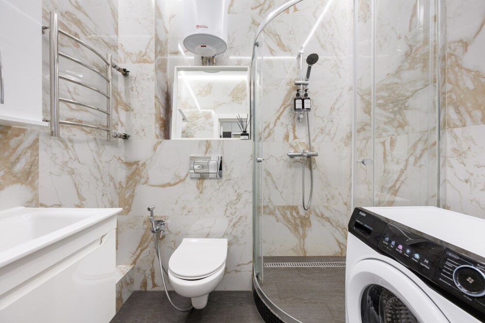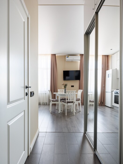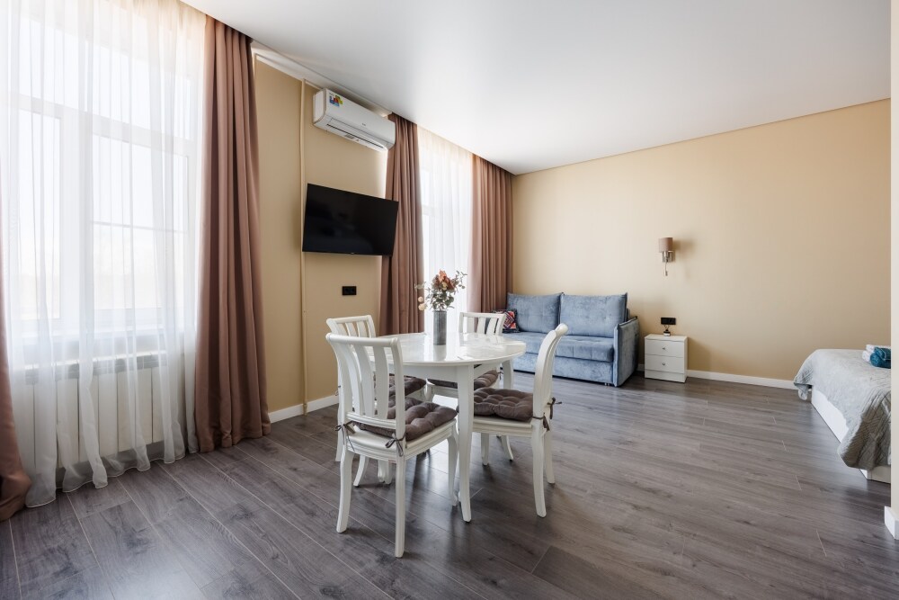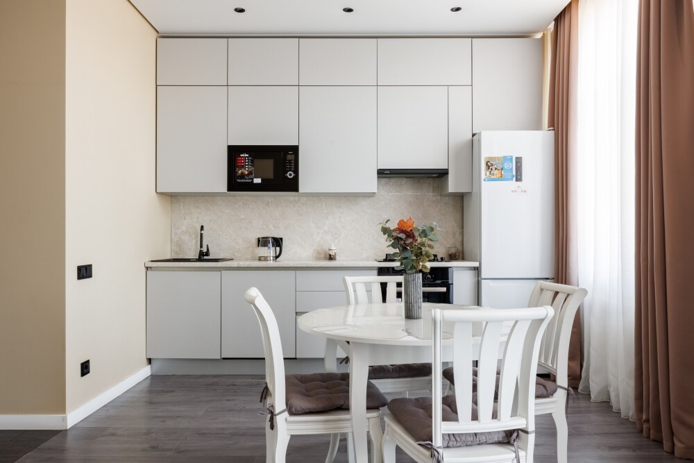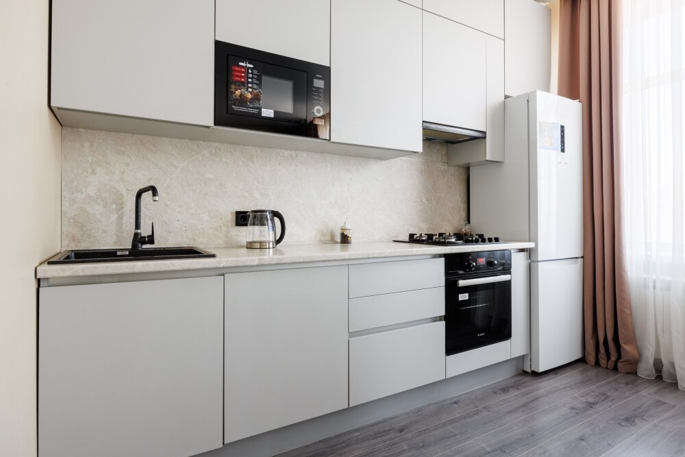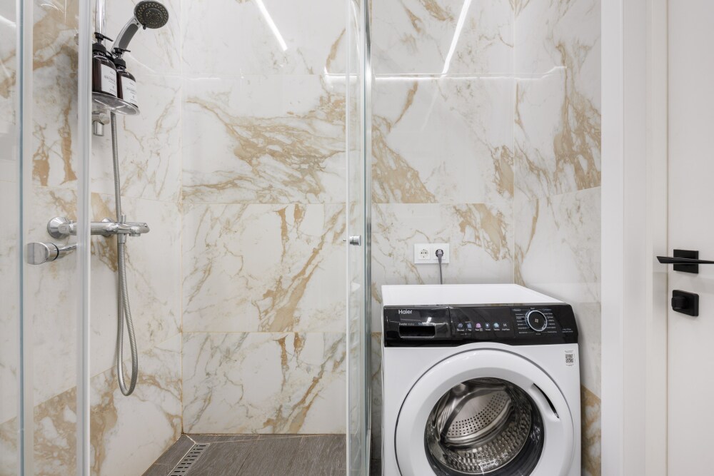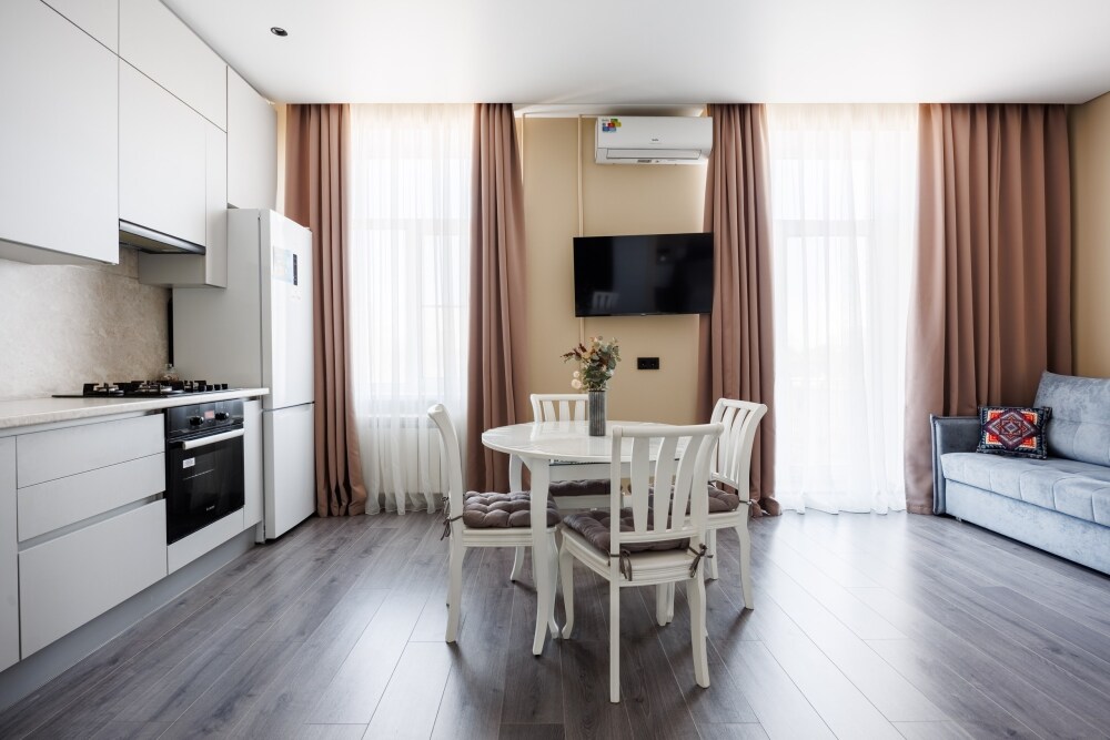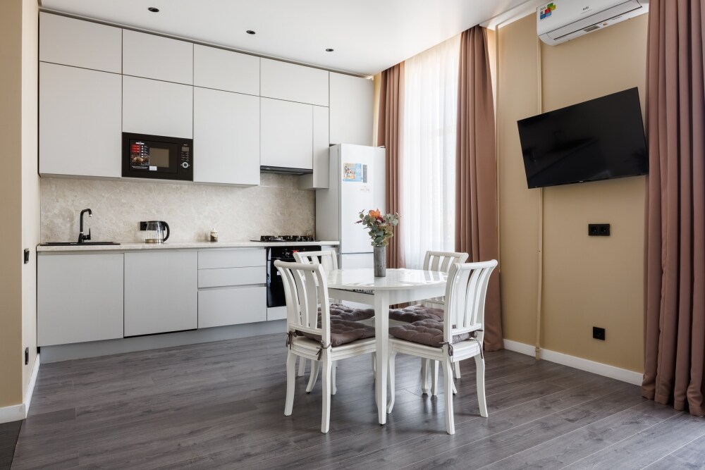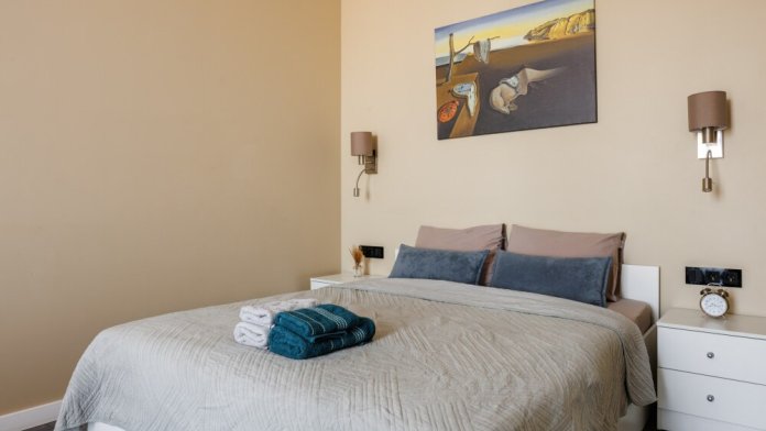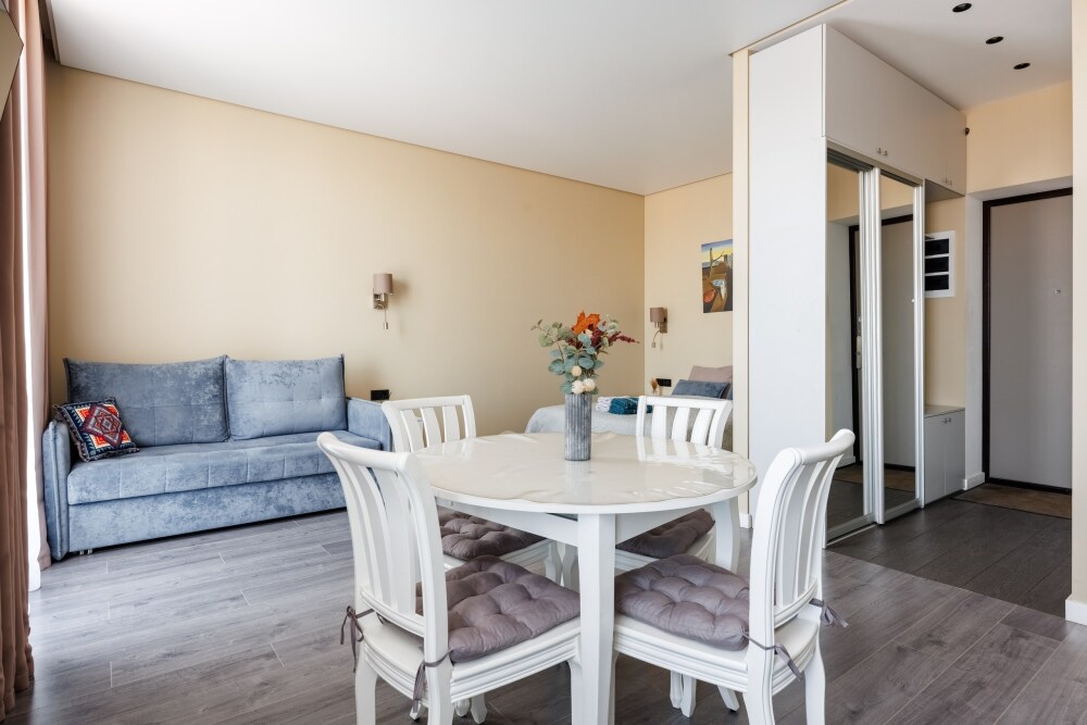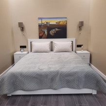 Квартира оснащена всем необходимым для проживания: кондиционер, бесплатный wi-fi, посудомоечная машина, холодильник, газовая плита и духовка, микроволновка, стиральная машина и многое другое. Комфортная двуспальная кровать и раскладывающийся диван свободно вместят четырех гостей. Идеальный вариант как для молодых пар, так и для семей с детьми.