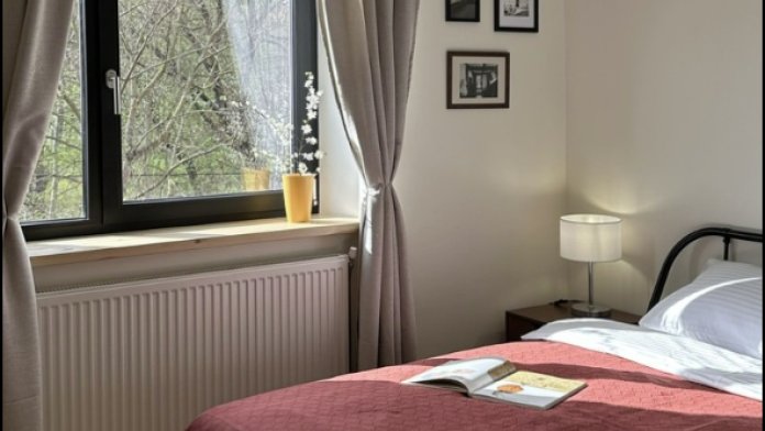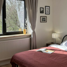 Про комфорт: двуспальная кровать 160х200, раскладной двуспальный диван 140х200, телевизор SmartTV, интернет, холодильник, микроволновка, плита, чайник, фен, утюг, пылесос, стиральная машина, гладильная доска, сушилка для одежды, шторы блэкаут, комплект полотенец на каждого гостя.