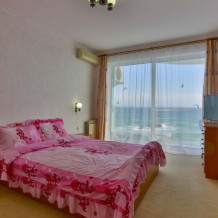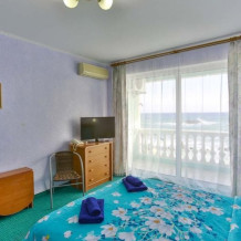 Апартаменты с видом на море, с балконом, 2 этаж. Кухня оборудована плитой, духовкой, посудомоечной машиной, микроволновой печью, электрочайником. Большой набор посуды. Обеденная зона, диван раскладывается.