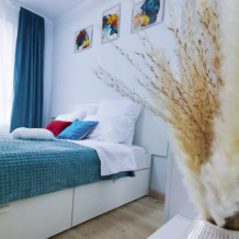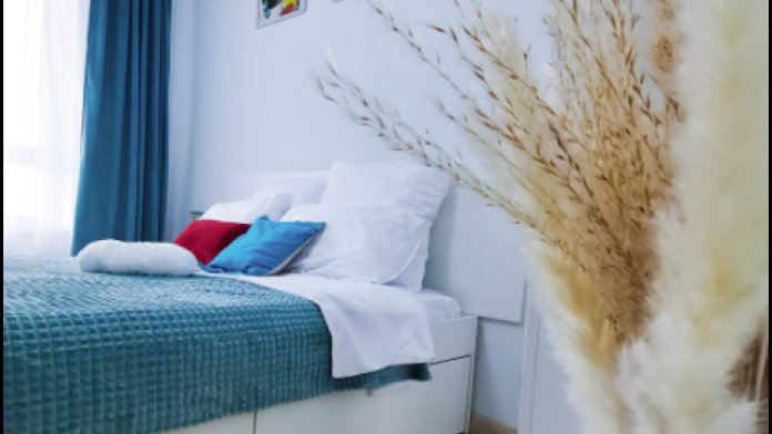Просторная квартира вмещает максимум 6 человек: есть 2 двухспальные кровати с ортопедическими матрасами и диван.