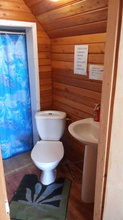 Летний корпус «Гостевой». В номере туалет, раковина, душевая, кровать односпальная, шкаф, тумбочка, зеркало, столик, стулья, коврики.