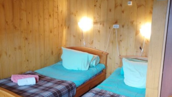 Летний корпус «Стандарт». В номере душевая кабина, туалет, горячая и холодная вода, односпальная кровать, зеркало, тумбочка, коврик).