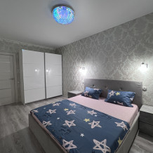 На кухне электрочайник Тефаль, микроволновка, холодильник, посудомоечная машина, духовой шкаф, электроплита. Приятное освещение, натяжные потолки. Ремонт делался для себя, поэтому вся квартира продуманна до мелочей. В каждой комнате есть телевизор. Кровать широкая, матрас удобный, ортопедический, прикроватные тумбы. Имеется пылесос. Ванна просторная, оборудована шкафчиком для хранения полотенец.