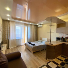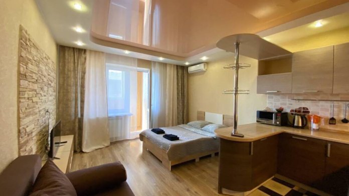 Квартира полностью укомплектованная для проживания 4-х человек. Для гостей имеется двуспальная кровать и 2-местный раскладной диван, а так же кухонная зона, включающая всё необходимое для приготовления пищи. Санузел совмещенный. В квартире есть всё для стирки и глажки белья, а так же фен, постельное бель, полотенца и тапочки. Работает Wi-Fi и кабельное телевидение. Приятным бонусом в летний период будет наличие кондиционера!