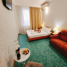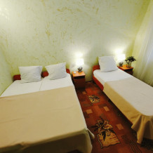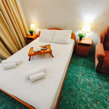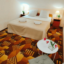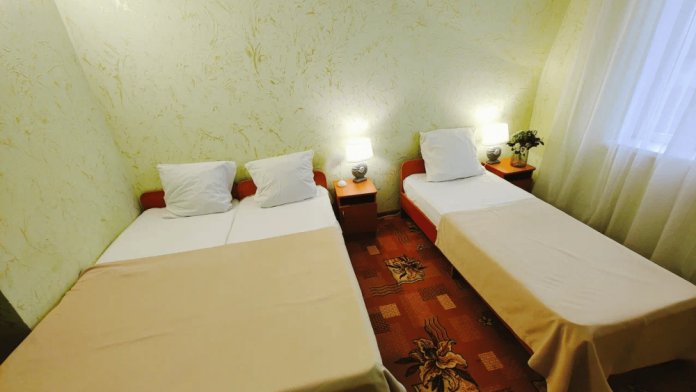 Для пожилых людей, бабушек и дедушек с внуками. Подходит для длительного проживания семей с дальнего Севера. 3 этаж. Двухспальная кровать. Не раздвижная. Диван 2-спальный, для двоих подростов до 12 лет. Либо дети на кровати, взрослый на диване. Часть номеров. Две односпальные кровати. Обычный конструктор, можно ставить как одна двухспальная. Диван 2-спальный, для двоих подростов до 12 лет. Вместительный шкаф. Телевизор, холодильник, кондиционер, wi-fi. Санузел (душ, туалет в номере). Фен по запросу.
