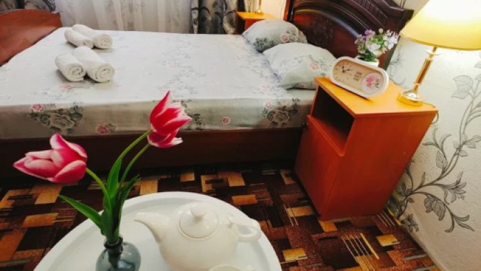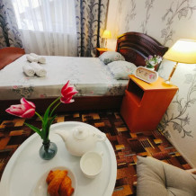 Уютная атмосфера для большой семьи, либо компании. В каждой комнате окно. Первая комната двухспальная кровать и кресло-кровать, вторая комната две односпальные кровати. В кухне-гостинной большой раскладной диван. Встроенный вместительный шкаф, тумбочка, стол.