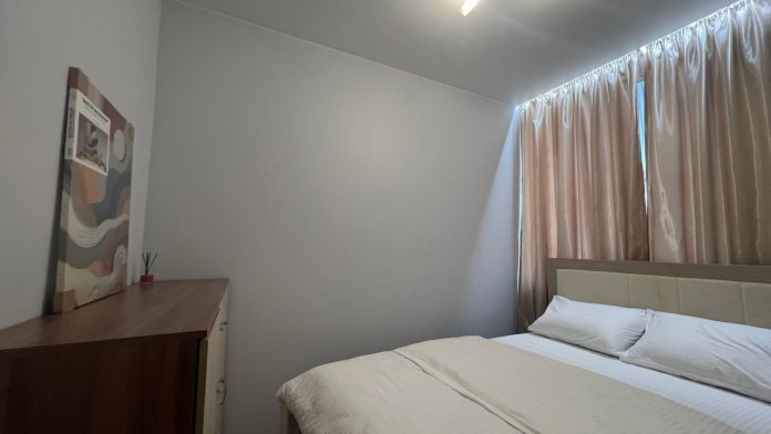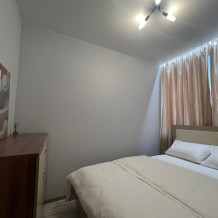 На кухне электрочайник, микроволновка, холодильник, духовой шкаф, электроплита. Приятное освещение. Есть телевизор. Кровать, матрас удобный. Двуспальный диван.