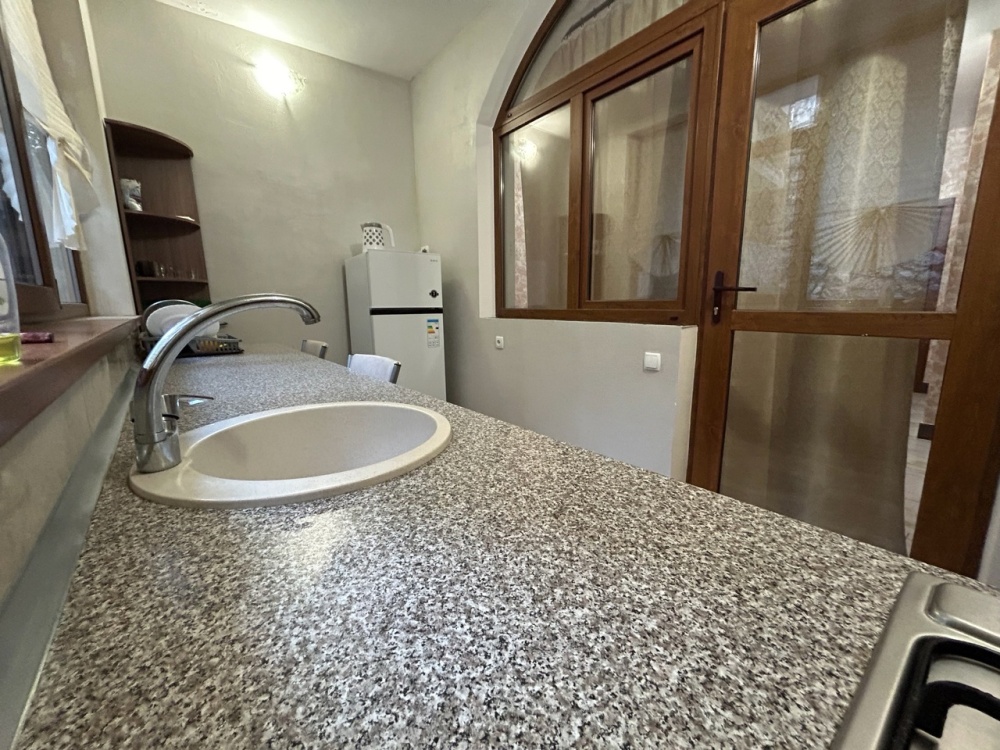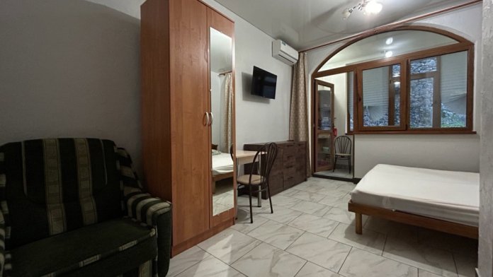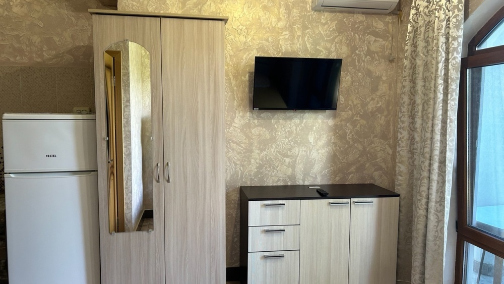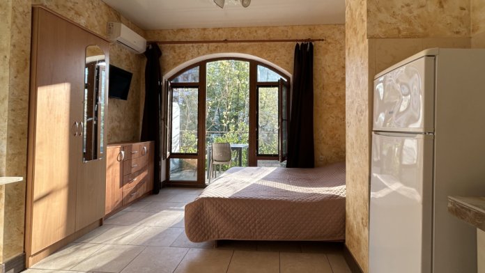 Солнечная сторона, собственный балкон со столиком и стульями, всегда есть возможность посидеть на солнце, спрятаться в тени виноградной лозы. Полностью оборудована для проживания, с собственной кухней (холодильник, плита, чайник, раковина, приборы, посуда).
