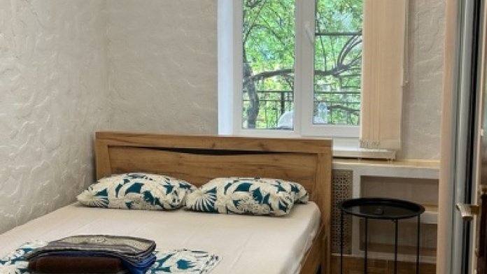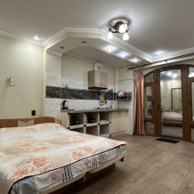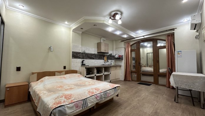 Студия полностью оборудована для проживания, с собственной кухней (холодильник, плита, эл. чайник, раковина, посуда, приборы). Спальные места: двуспальная кровать160х200; диван 140х200. При заселении предоставляется постельное бельё, полотенца.