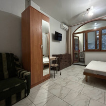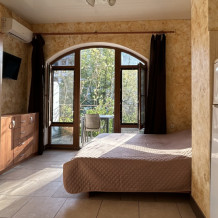 Номер-студия на 3 этаже четырёхэтажного гостевого дома. Солнечная сторона, собственный балкон со столиком и стульями, всегда есть возможность посидеть на солнце, спрятаться в тени виноградной лозы.