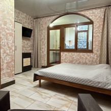 Отельный вход с лестницей, с выходом на общую террасу 2 этажа, Полностью оборудован для проживания, с собственной кухней (холодильник, плита, чайник, раковина, СВЧ, посуда, столовые приборы. Спальные места: двуспальная кровать 140х200, двуспальный диван 160х200. При заселении предоставляется постельное бельё, полотенца, средства гигиены.