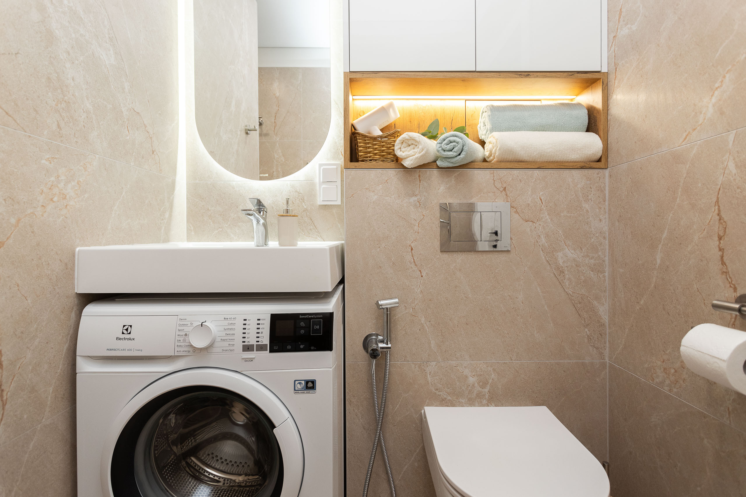 - Стильный санузел с душевой кабиной в свежей, лаконичной отделке.