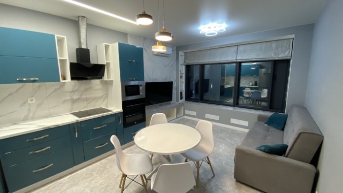 Квартира по факту евродвушка: отдельная кухня совмещённая с залом и отдельная спальня с рабочим кабинетом (выведена отдельная интернет розетка).