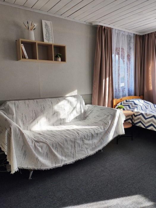 Двухместный номер на втором этаже - Ваш личный оазис тишины и покоя. Большая кровать манит своим ортопедическим матрасом и всесезонным одеялом, обещая сон, как у младенца (даже если Вы им уже давно не являетесь).