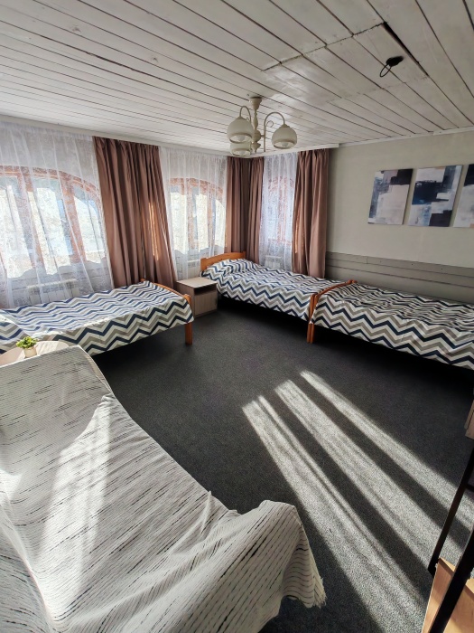 Добро пожаловать в наш просторный номер на первом этаже, где морская тематика встречается с домашним уютом. Большая кровать для родителей и две односпальные кровати для ваших маленьких матросов.