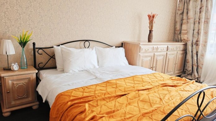 - Двуспальная кровать 160х200. Заправлена белоснежным постельным бельем.