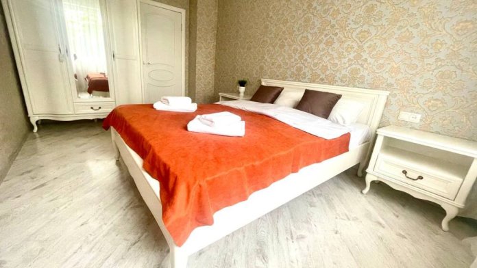 - Двуспальная кровать 160х200. Заправлена белоснежным постельным бельем.
