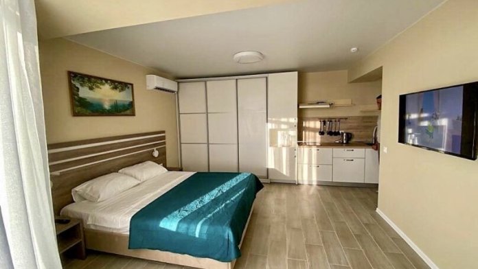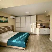 В апартаментах сделан стильный качественный ремонт 2021г, есть закрытый балкон с видом на море. Размещение до 4 человек (двуспальная кровать с ортопедическим матрацем 160x220 и раскладной диван). В апартаментах имеется всё для комфортного проживания: кондиционер, климат контроль (теплый пол), холодильник, микроволновая печь, индукционная плита, набор кухонной посуды, свежее качественное постельное бельё, полотенца, гладильная доска, утюг, фен, 2 ЖК телевизора со смарт-TV, Wi-Fi.