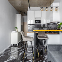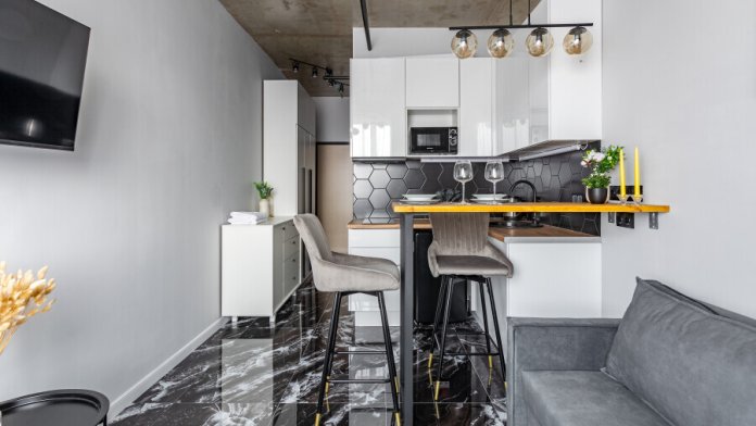 - Стильный кухонный гарнитур со всем необходимым для приготовления любимой домашней еды (техника, кухонные принадлежности, посуда, столовые приборы)