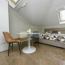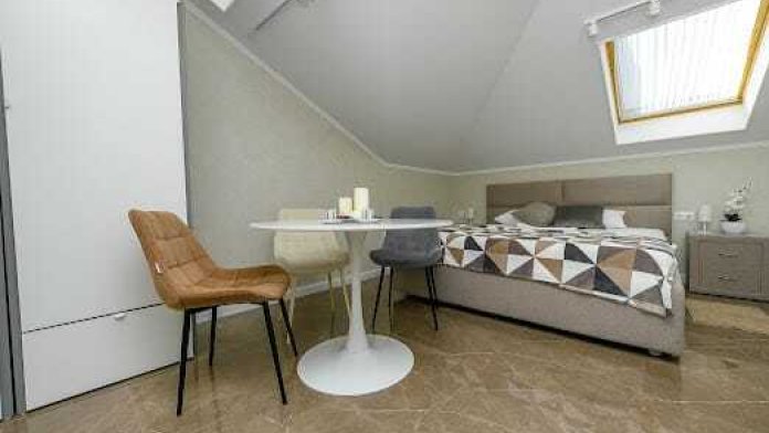 Пространство студии: Двуспальная кровать, обеденный стол, гардеробная и шкаф для одежды, шторы плиссе блекаут, телевизор, кондиционер, Wi-Fi.