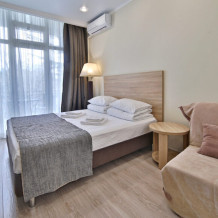 Двухместный стандартный номер на море в новом жилом комплексе бизнес класса «Покровский Парк» в самом низу микрорайона Светлана, вблизи с парком Дендрарий, Сочинским цирком и центральной набережной. Парковки гостевой на территории нет. Но рядом с нами есть платная парковка и множество различных кафе, столовых, ресторанов, а также супермаркеты с кулинарией. Также в корпусе 10Д есть кофейня с завтраками на 1 этаже.