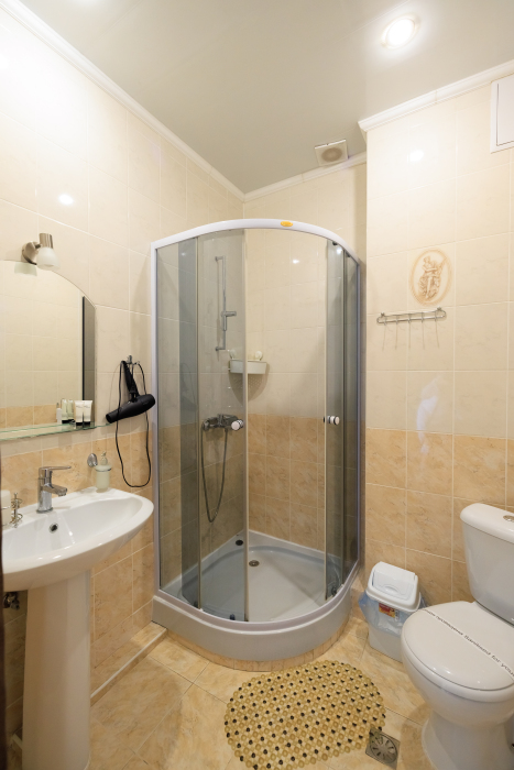 В ванной комнате: зеркало, комплект полотенец, 2 халата, тапочки, косметические принадлежности, коврик для ванной.