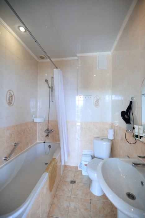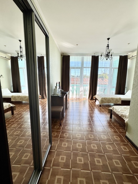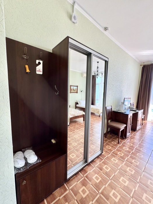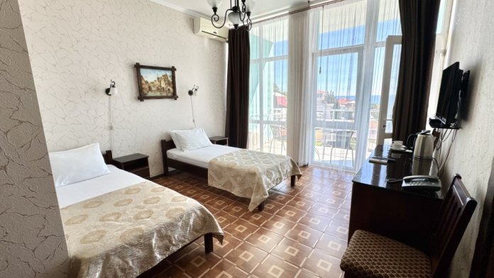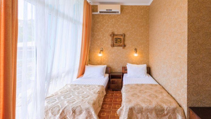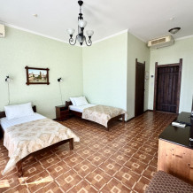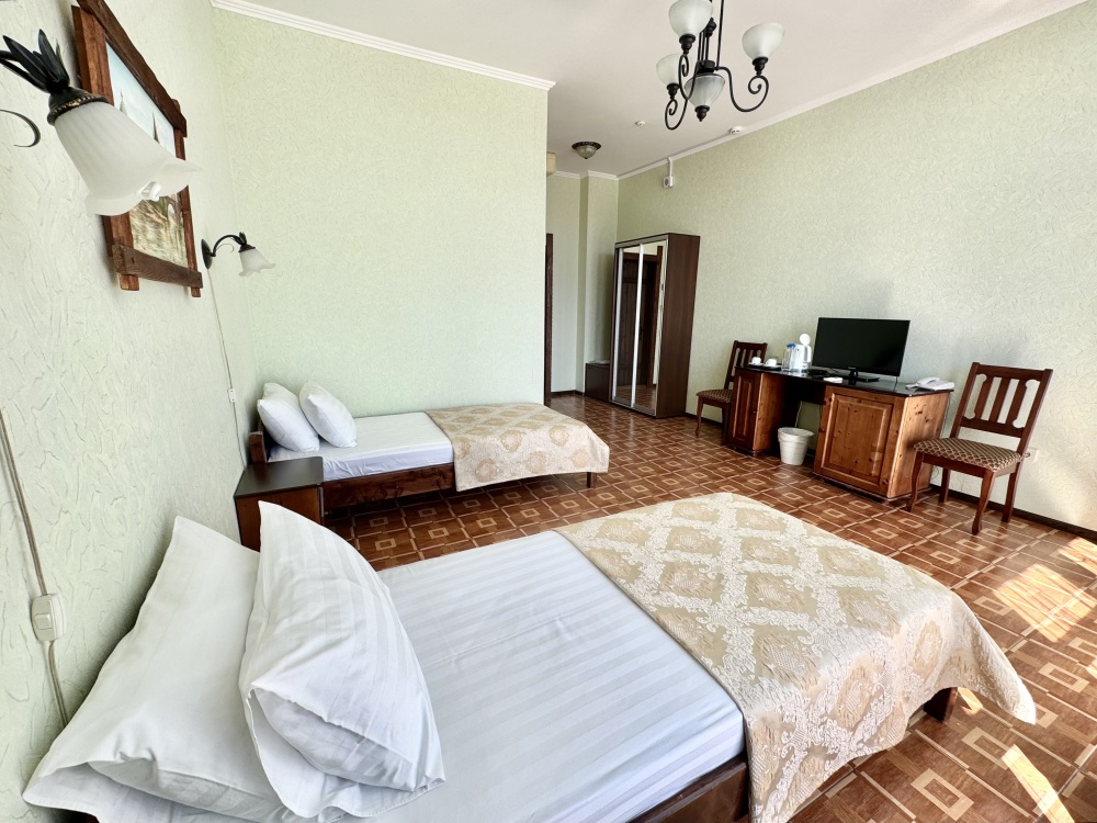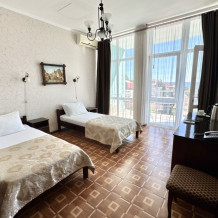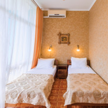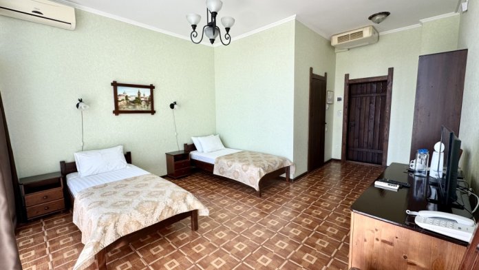 В номере: две односпальные кровати (80 см. х 1800 см.); кондиционер, шкаф для одежды, прикроватные тумбы, стол, стул, чайная посуда, телефон, возможность подключения к интернету через Wi-Fi, отдельный балкон с мебелью.