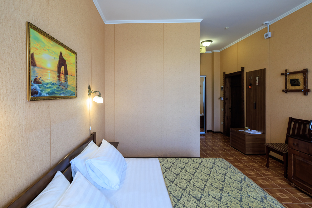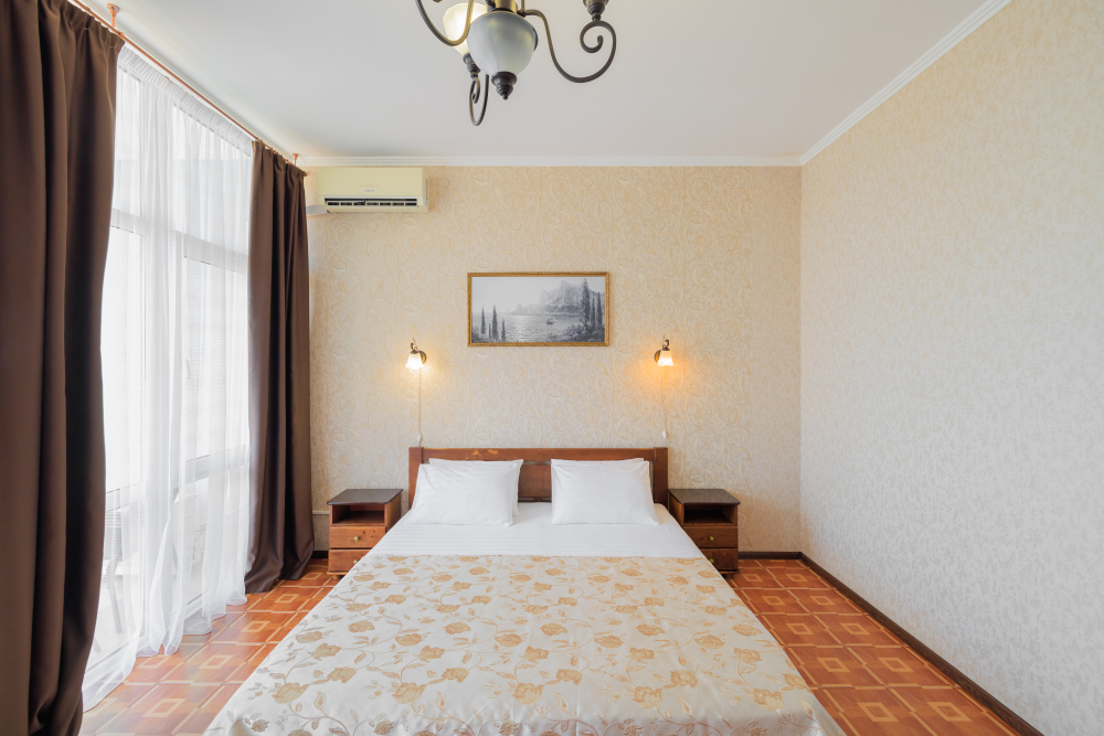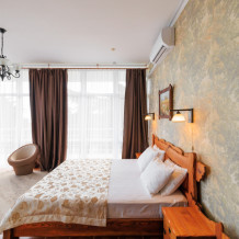 В номере: двуспальная кровать (1800 см х 2000 см), кондиционер, шкаф для одежды, прикроватные тумбы, стол, стул, чайная посуда, телефон, возможность подключения к интернету через Wi-Fi, отдельный балкон с мебелью.