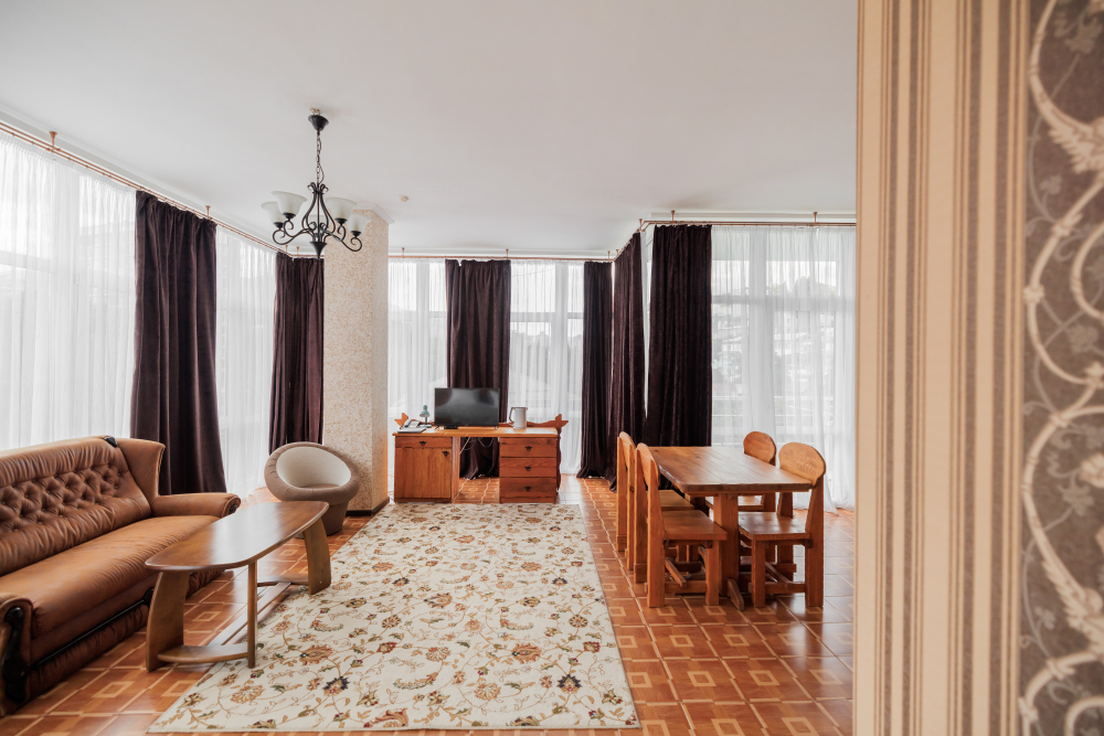 В номере: двуспальная кровать (1800 см х 2000 см), кондиционер шкаф для одежды, журнальный столик, прикроватные тумбы, раскладной диван, стол, стул, чайная посуда, сейф, телефон, LCD телевизор 108 см. по диагонали, Wi-Fi, витражные окна, отдельный балкон с мебелью.