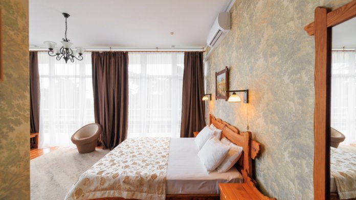 В номере: двуспальная кровать (1800 см х 2000 см), кондиционер, шкаф для одежды, прикроватные тумбы, стол, стул, чайная посуда, телефон, возможность подключения к интернету через