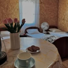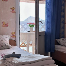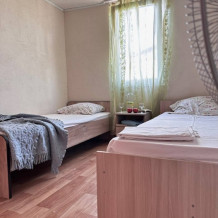 В номере три удобные односпальные кровати (можно соединять), холодильник, вентилятор, телевизор, вешалка для одежды, зеркало, тумбы прикроватные, чайник, столик со стульями. Постельное белье выдается.