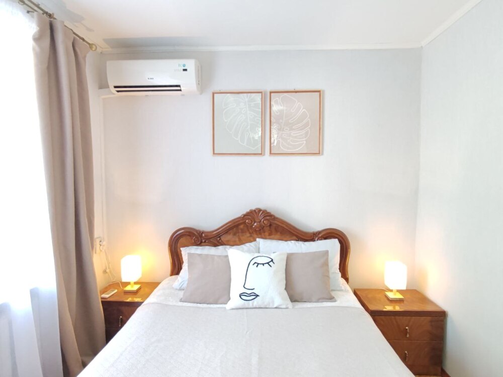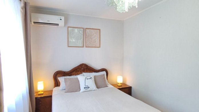 Квартира оснащена: кондиционер, утюг, гладильная доска, сушилка для белья, холодильник, газовая плита, электрический чайник, СВЧ-печь, ванная, набор посуды: тарелки, стаканы, кастрюли, сковорода; столовые приборы, телевизор, стиральная машина, чистое постельное белье, полотенца, фен. Детская площадка во дворе дома.