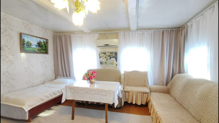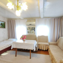 Дом полностью меблированный. В доме 2 комнаты, 6 спальных мест, большой зал, уютная кухня, есть свое автономное отопление, холодная и горячая вода, ванна, туалет, кондиционер, кабельное телевидение, микроволновая печь, холодильник, стиральная машина-автомат, фен, утюг.