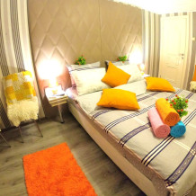 Хороший ремонт, теплая домашняя атмосфера. Мебель современная. Из бытовой техники: холодильник, стиральная машина, электрический чайник, утюг, гладильная доска, телевизоры. Свежее, ароматное хлопковое постельные белье, полотенца, средства гигиены, необходимая посуда. Охрана на ресепшн и видеонаблюдение в холлах.