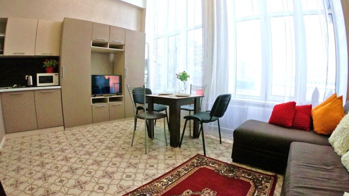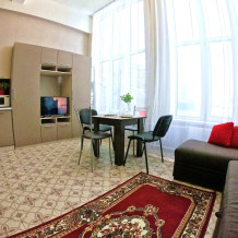 Хороший ремонт, теплая домашняя атмосфера. Мебель современная. Из бытовой техники: холодильник, стиральная машина, электрический чайник, утюг, гладильная доска, телевизоры. Свежее, ароматное хлопковое постельные белье, полотенца, средства гигиены, необходимая посуда. Охрана на ресепшн и видеонаблюдение в холлах.