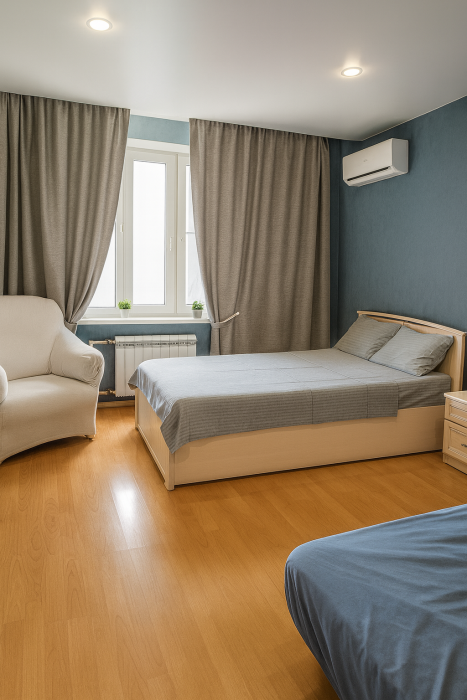 Просторная квартира с огромной лоджией и кондиционером рядом со станцией Кутузовская (МЦД-2): три раздельных спальных места, отчётные документы и бесконтактное заселение 24/7. Отличный вариант для командировочных или семейного размещения.