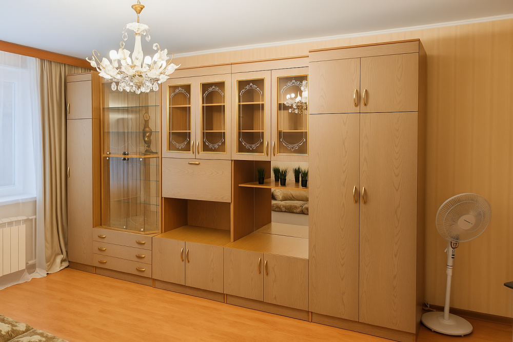 • Кухня с техникой и посудой (холодильник, плита, микроволновка, чайник)