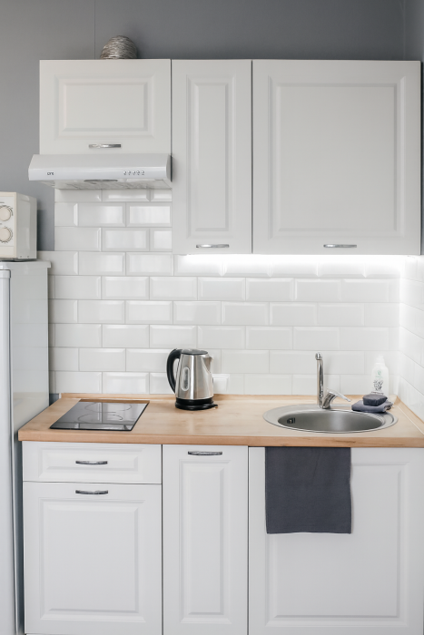 • Кухня с техникой и посудой (холодильник, плита, микроволновка, чайник)