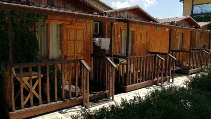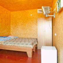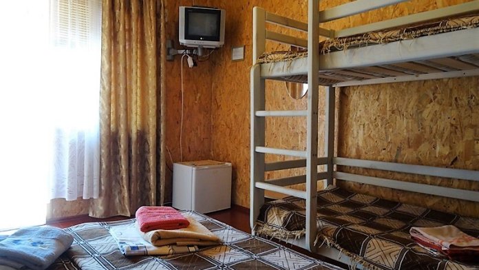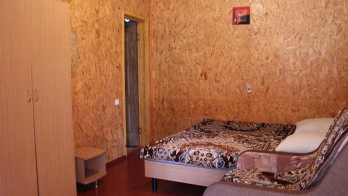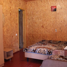 С отдельным входом для проживания семьи с двумя детьми. Мебель: две полуторные кровати, раскладное кресло, индивидуальные тумбочки прикроватные,шкаф двустворчатый с вешалками для вещей;зеркало.Санузел: душевая комната,туалет - общие на 3-4 номера.