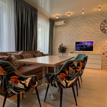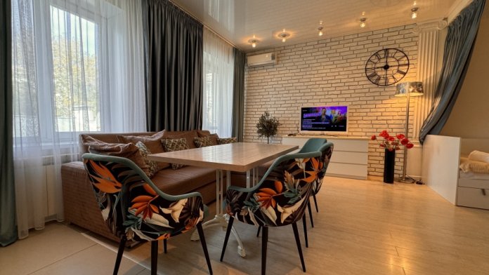 Спальные места: Квартира рассчитана на 7 человек, оборудована двумя комфортными двуспальными кроватями (150x200 см) с удобным матрацем, и раскладывающимся двуспальным диваном (160*200), также 1,5 спальным местом обеспечивающим качественный и здоровый сон. На каждую кровать и диван идет следующий комплект: 2 подушки, 2 наволочки, двуспальное одеяло, пододеяльник, простынь.