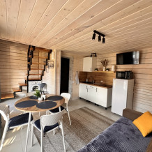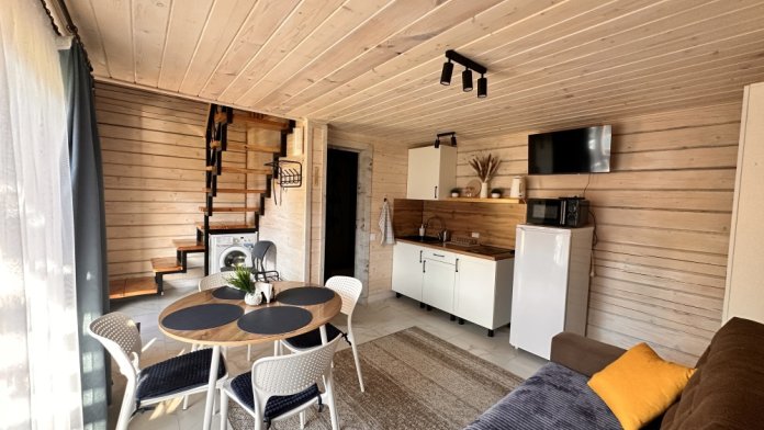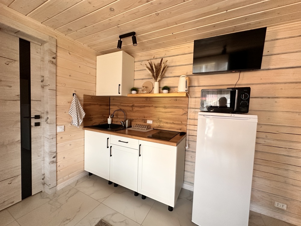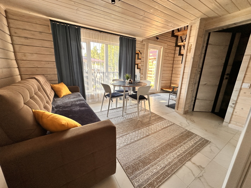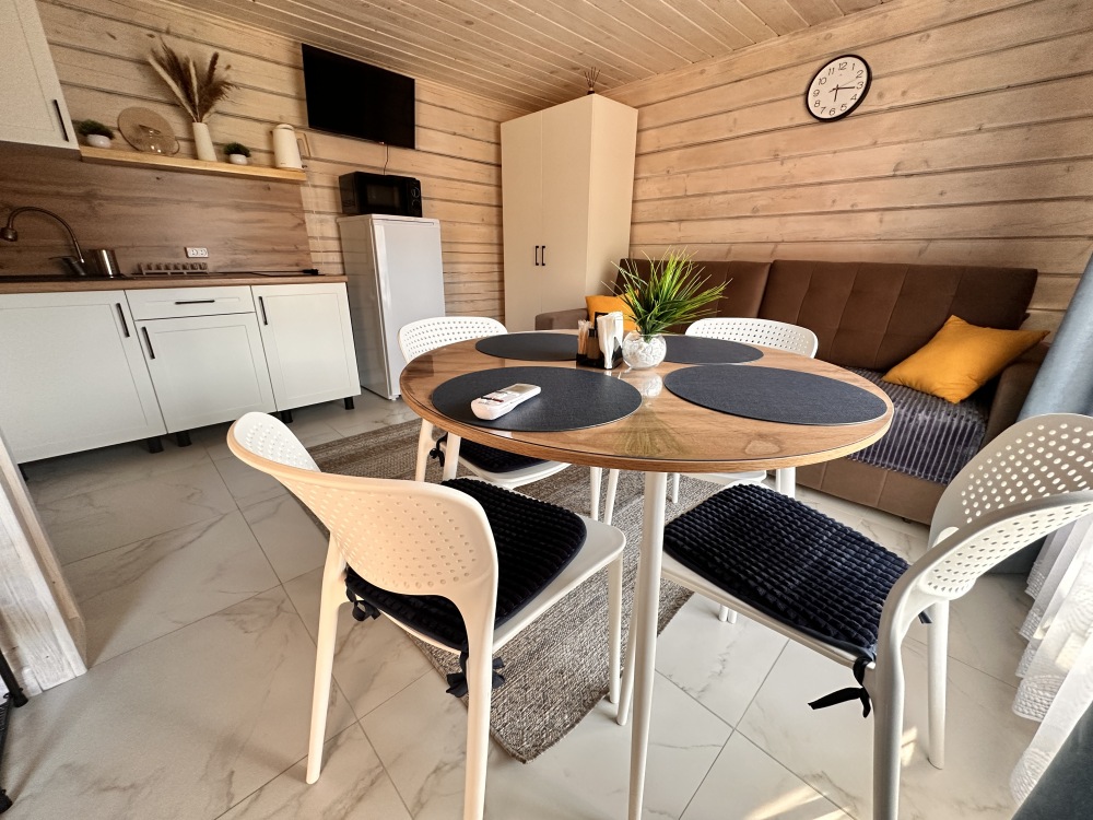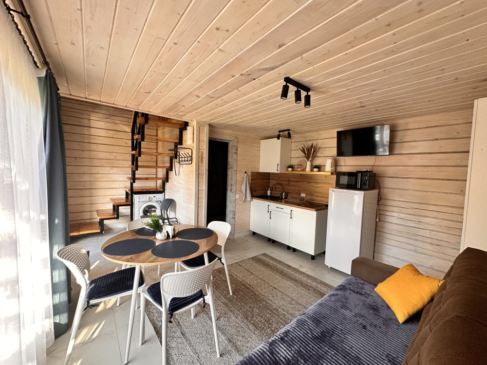 На 1 этаже: гостиная, полностью оборудованная кухонная зона (холодильник, эл. плита 2 конфорки, свч печь, чайник, комплект посуды). Стиральная машина, смарт телевизор, Wi-Fi, диван раскладывается на 2 полноценных спальных места 158*200. Санузел с душевой кабиной (комплект полотенец для каждого гостя, фен, жидкое мыло, гель для душа, шампунь, кондиционер, зубной набор, туалетная бумага, ватные палочки и ватные диски). Терраса с уличной обеденной зоной.
