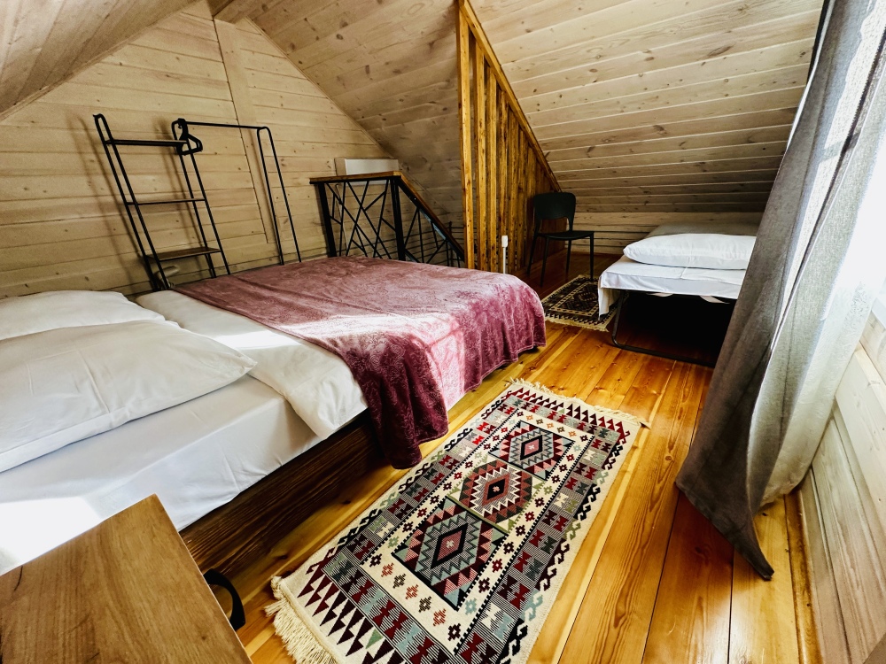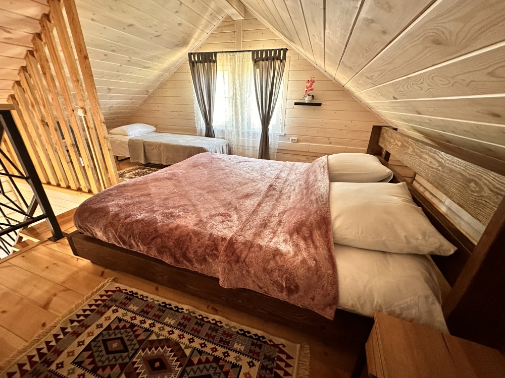 На 2 этаже: Двуместная кровать 160*200 и дополнительное односпальное место - раскладная кровать-пуф 80*200.